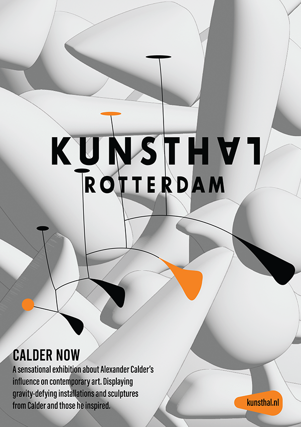 My process for this piece was extensive, and I reworked it multiple times over months. Below I have included the two previous versions of the poster. The first draft lacked the meaning of what the exhibit and Kunsthal represented. I changed the shape of the 3D objects to represent Calder's shapes instead of the inorganic shapes I used previously. In addition, I included Calder's flat mobile in the foreground to emphasize his influence. Finally, I finished the piece by adding the Kunsthal's signature orange throughout.