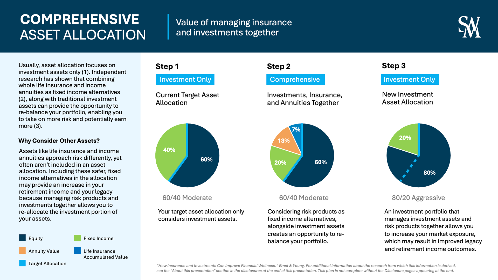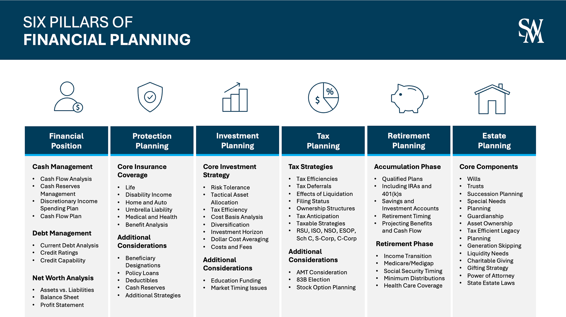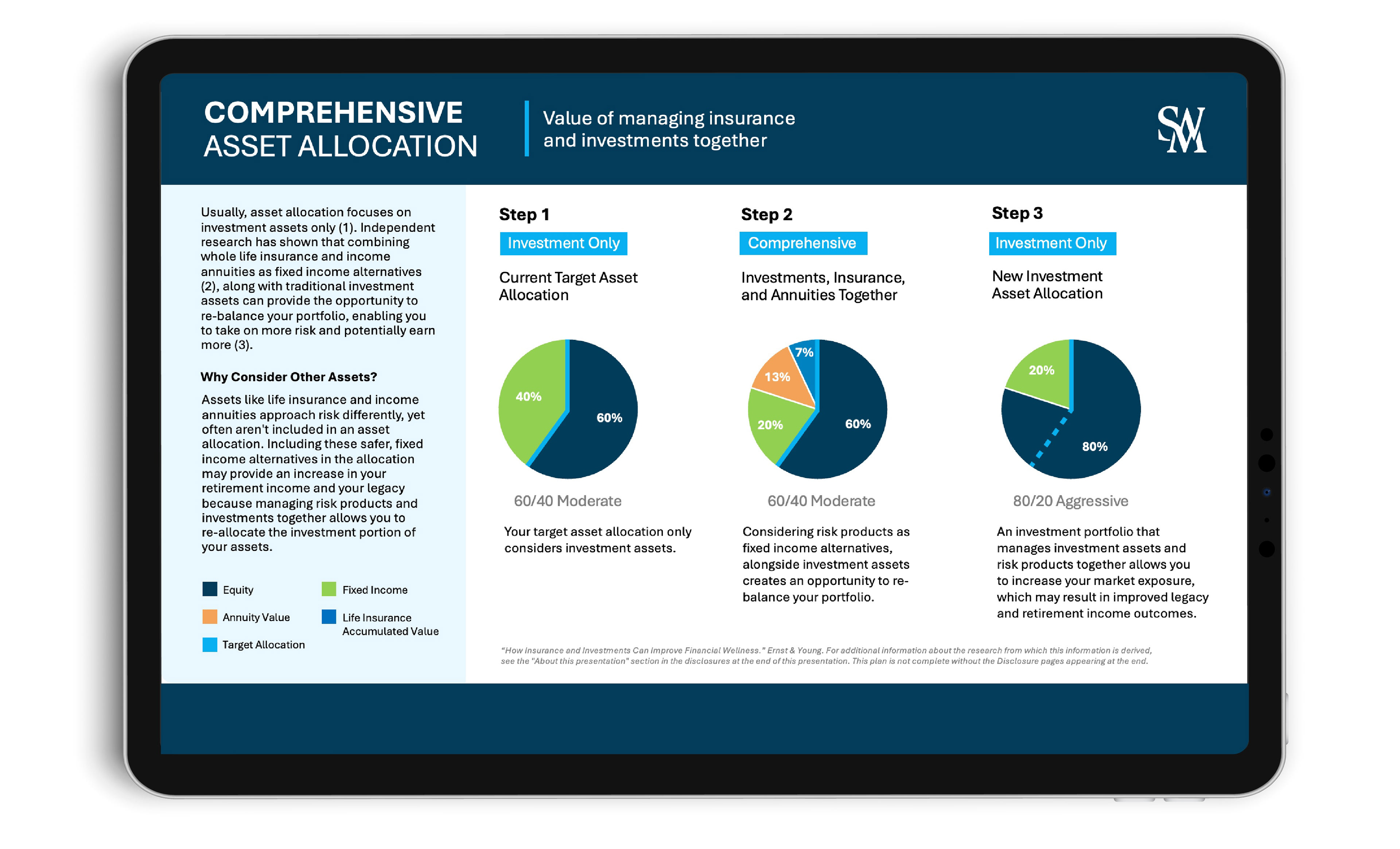 SWM prioritizes the customer, their families, and goals when it comes to investing. But their current "Introduction to Investing" PowerPoint was not very client friendly. SWM wanted a clean, sleek, and organized slide deck that outlined detail-heavy data and information regarding investments. By compiling the information in a visually digestable way their clients can easily understand how to financially plan with SWM. SWM did not have an established brand besides a logo. I decided to implement a color, font, and icon system within the PowerPoint template for future use.